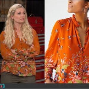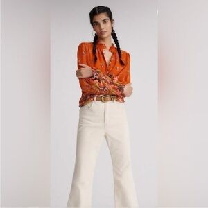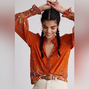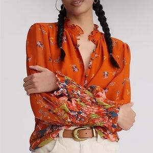 Anthropologie Orange Floral Button Down Chiffon Blouse