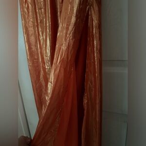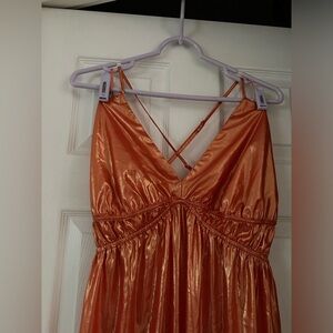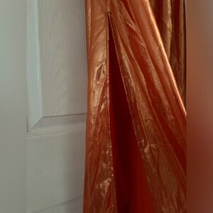 Elegant orange maxi dress. Features a deep V-neck and side slit. Perfect for summer occasions.