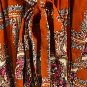 NWT porridge label. Vibrant orange and multicolor paisley print dress bought from Anthropologie. Button up top and flowy skirt with tie and loops around waist. Soft silky material. Great dress for dancing!