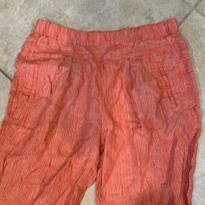 Gently worn Anthropologie Orange Striped Linen Pull On Pants women’s size Medium. Linen, orange with tan stripes, elastic waist- pull on style, drop waist, hip pockets, relaxed thru hips and thighs, straight fit, crop length. Offers accepted.
