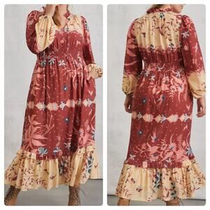 Floral bouquets make an elegant statement on this maxi dress, while ruffled touches impart an air of carefree sophistication.