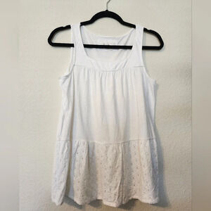 Will fit small. Eyelet bottom, Square Neckline, flowy, no flaws.