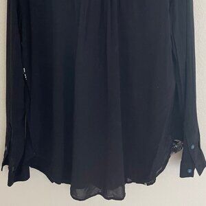 Black Button Down Blouse with Unique White Floral Print; Front Pocket and Two Button Cuffs.