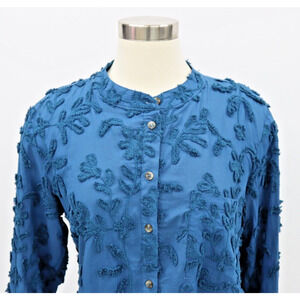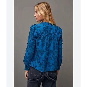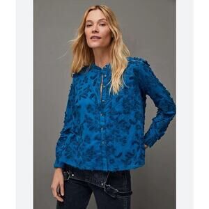 Add a touch of elegance to your wardrobe with this Anthropologie PILCRO Whitney Textured Trapeze Buttondown Top in Peacock Blue. The classic fit and long sleeve design make it suitable for any casual occasion. The button-up closure and embroidered accents give it a unique texture that will make you stand out from the crowd. Made of 100% cotton, this top is both comfortable and durable. Available in size M, it is perfect for women who want to add a pop of color to their outfit.