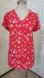 Red flowy lightweight fabric with a white floral print and blue accents. V-neck, short cap cuffed Dolman sleeves. Loose comfortable fit. Pit to pit 20" Length 25" Excellent condition