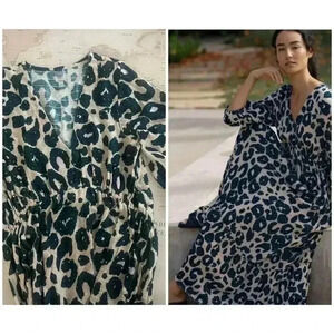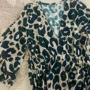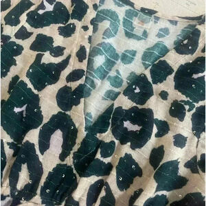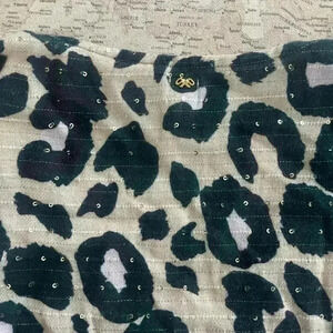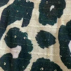 Cream maxi dress with green cheetah print designs, embroidered with sequins