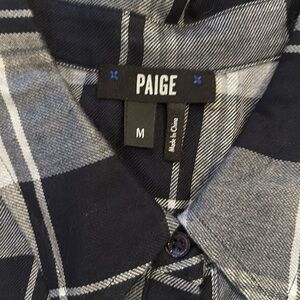 Stylish blue and gray plaid soft flannel shirt by Paige from Anthropologie. Tie sleeve detail. Features a classic button-up design. This is a great piece for this fall!