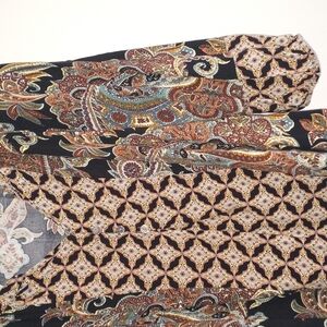 Elegant paisley blouse with intricate patterns. Features a mix of black and brown tones. Perfect for a stylish look.