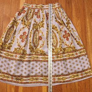 a-line, dirndl, boho, feminine, scarf print, french, pastel, lavender, statement skirt, gathered skirt, midi skirt