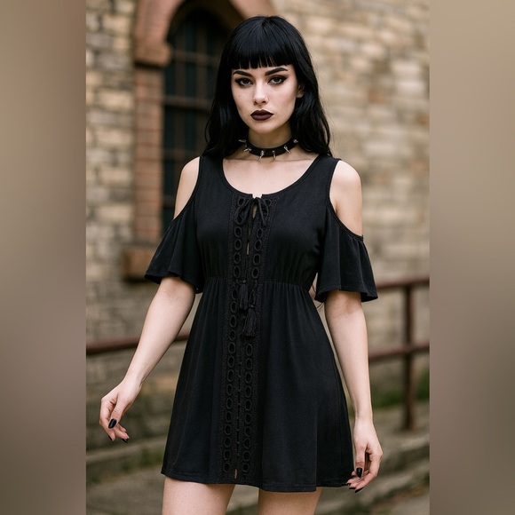 Effortless and easy to wear, this Paper Crane black cold shoulder dress combines comfort with a boho vibe. Features an ash wash fabric flutter short sleeves with cutout shoulders, lace-up neckline with tassel ties, and embroidered eyelet trim down the front. The relaxed fit makes it perfect for summer outings, festivals, or casual weekends.