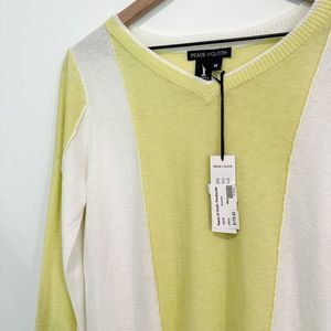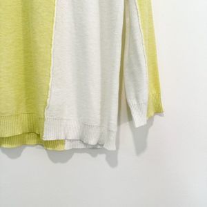 Peep this super cute lightweight sweater from Anthropologie Peace of Cloth! This gal is a gorgeous colorblock pattern in a sweet yellow and white. Features exposed seams and a contrasting rib knit at the hem, neckline, and sleeve. V neck. 3/4 sleeves. Comfortable cotton linen blend.