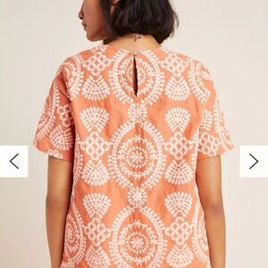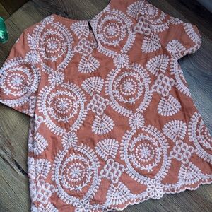 Chic peach blouse with intricate embroidery. Ideal for casual elegance.