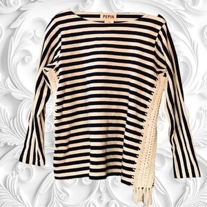 Anthropologie Pepin Blue Striped Ponte Top With Crochet Insets On Sides
