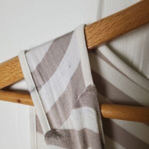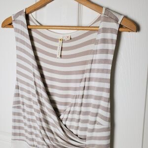 Anthropologie Little Yellow Button "Perilla" dress. Cream colored stripes, overlapping v-neck, and fabric flower belt details. Made of a rayon and spandex blend for a soft and stretchy jersey knit fabric. Has some pilling, especially at the underarm areas.