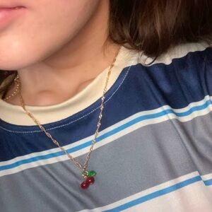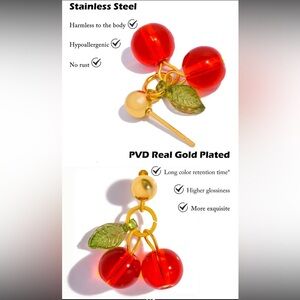 Vibrant cherry drop earrings with gold accents. Features red cherries and green leaves.
