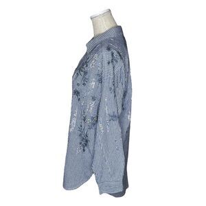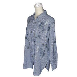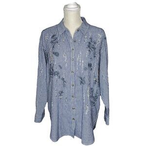 Anthropologie Pilcro Beaded & Embroidered Pinstriped Textured Button Down Top. Super bohemian button down boyfriend-style seersucker that features embroidered flowers, beading on a blue and white striped chambray/lightweight denim feel material that is textured. Long sleeves with button cuffs. Has an oversized fit. 100% cotton. Dry clean only. This shirt has been freshly dry cleaned and pressed. Measurements in pictures.