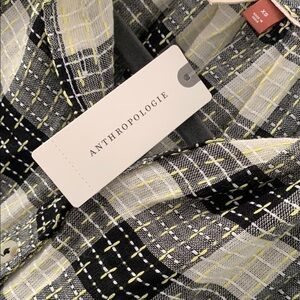 This elegant top from Anthropologie features a striking black and white color scheme with a relaxed fit and cuffed sleeves. The button-down style offers a versatile look, perfect for both casual and formal settings. Its collarless design adds a contemporary flair to this timeless piece.