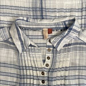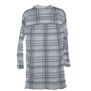 Stylish plaid tunic by Pilcro. Features a blue and white pattern. Lightweight and comfortable.