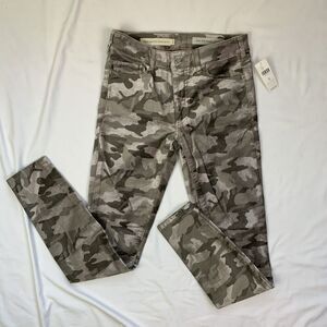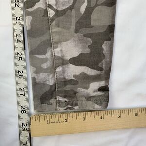 Shimmery silver, gray, and beige camouflage pattern velvet high rise skinny jeans by Pilcro.