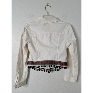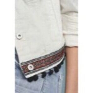 Anthropologie Pilcro Stretch Denim Jacket Intricate Embroidered Hem Pom Pom White Size SP