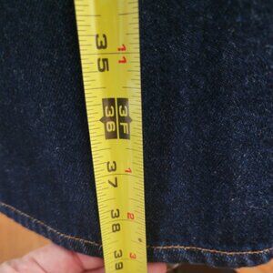 Beautiful dark blue denim jacket with snap closure, large pockets, and long length perfect for fall.