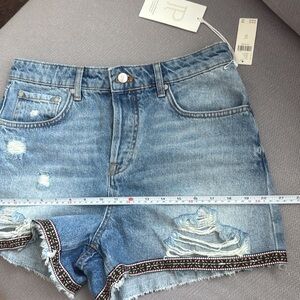 Anthropologie Pilcro Distressed Blue Jean Shorts with Embroidered Hem .Chic distressed jean shorts with unique embroidery. Ideal for casual wear.