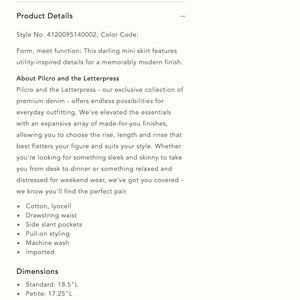 Form, meet function: This darling mini skirt features utility-inspired details for a memorably modern finish. 53% Cotton/48% lyocell. Drawstring waist. Side slant pockets with decorative stitching and slit back pockets (that are still sewn shut). The hem is rounded and there are slits on the sides, there are a couple of spots on the hem that show bubbled threads. Pull-on styling. Machine wash.