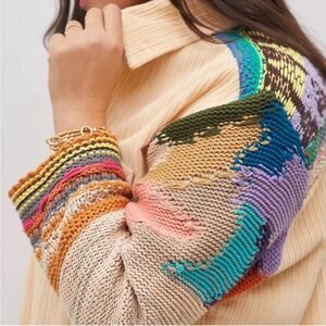 Corduroy is printed with tie dye/circle print. Sweater fabric has some loose stitching intentionally.