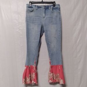 Distressed and faded jeans with inset coral and gold embroidered flare material.