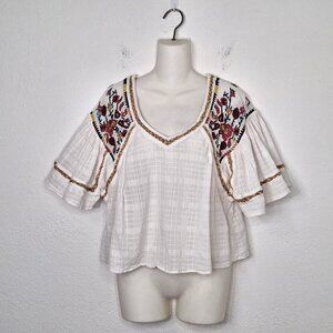 Pre-owned, good condition w/ minor flaw. Normal signs of wear. Pilcro by Anthropologie. Gorgeous floral embroidered on shoulders, neckline and trim over a semi-sheer white knit fabric. V-neckline. Crop. Relaxed fit. Flared bat sleeves. Breathable fabric. Size per tag: S (Small). Fabric: 100% Cotton. Style# OB1161507. Made in India. Size per tag does not guarantee desired fit, please see pictures for measurements.