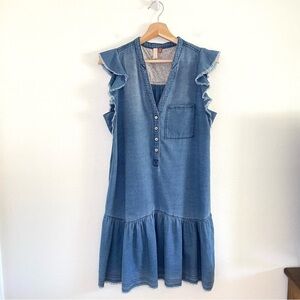 Anthropologie Pilcro Flounced Tunic Chambray Denim Flutter Sleeve Mini Dress, Size XS. Can also fit size Small, see measurements.