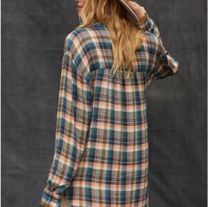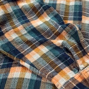 Anthropologie Pilcro Hadley Relaxed Plaid button down sz Lp. Green, blue, peach colors, 2 chest pockets, high low hemline. Has a drapy type fit, viscose polyester blend. Good used condition, don't see any holes or stains. Couple pulled threads (example in pics). Flat measurements approximately