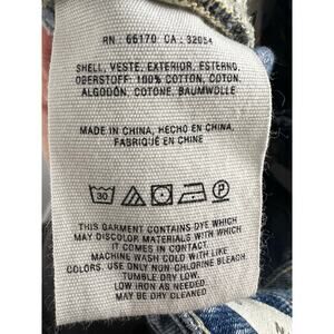 Features light wash, a few areas of very light distressing, and intentionally frayed hems.