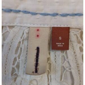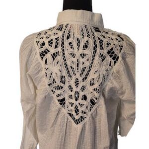 Anthropologie Pilcro Ivory Blouse with back lace insert. Boho, western, peasant style. Front buton up placket with lace outlined yoke. Slight puff sleeve. Button cuffs. 100% cotton. Excellent condition. Size small.