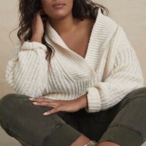 This chunky knit Pilcro Joyce V-Neck Sweater from Anthropologie in neutral ivory cream white is sumptuously soft. This layer is an effortless match for utilitarian pants and pencil skirts alike.