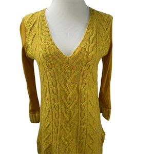 Anthropologie Pilcro and the Letterpress Pullover Sweater. Cute mix of sweater knit and light knit fabrics. The sweater knit is made of wool and nylon. The lighter knit fabric is a cotton modal blend. Both stretch. Cable knit pattern on sweater knit. This also has a marled pattern of yellow and green. V-neck. 3/4 sleeves.