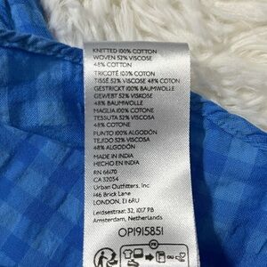 👉🏻 The blouse is light blue with a V-neck and long sleeves. It has a gathered waist and a lower section with a checked pattern.