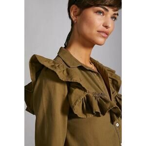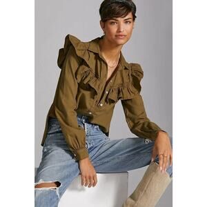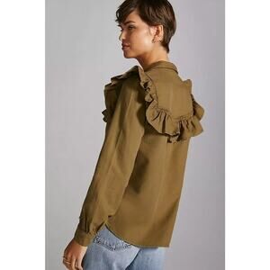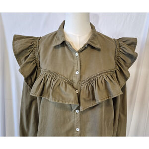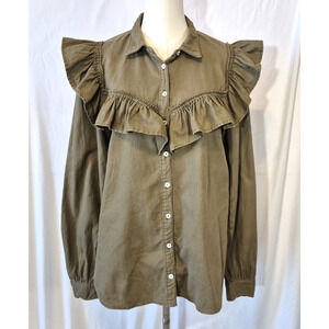 Anthropologie Pilcro Olive Green Ruffle Button Down Blouse Top Medium