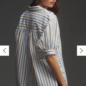 Style and Features: It's a cotton button-down shirt with a blue and white striped pattern, featuring puff sleeves and an oversized fit.