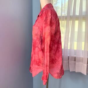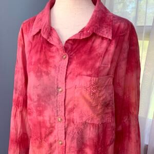 A beautiful button down shirt in a pink tone tie-dye that has just a touch of purple with an embroidered floral pattern. Button front and cuffs. In excellent used condition