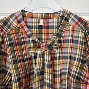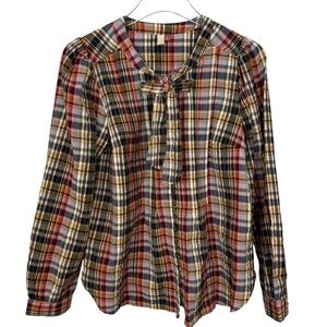 Anthropologie Pilcro Plaid Blouse Tie-Neck Button Down Peasant Top