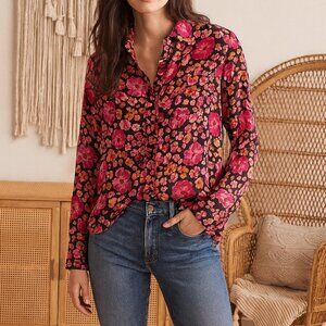 Add a touch of cottagecore charm to your wardrobe with this beautiful Anthropologie Pilcro floral blouse. Features bold purple and magenta blooms, button-down front, and long sleeves with button cuffs. Designed in a loose, oversized fit, this top pairs effortlessly with jeans, skirts, or layered under cozy knits for that dreamy prairie-inspired look.