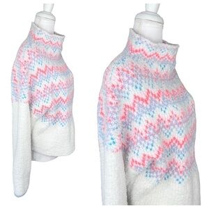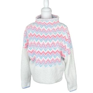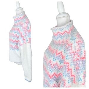 Pilcro and the Letterpress Anthropologie Selene chenille sweater. Mock neck/ funnel collar. Full sleeves. So cozy, snuggly soft! Boxy silhouette. Cream with fair isle pattern in neon/florescent orange, bright turquoise, and periwinkle (purple/blue). Boho chic at its best! Excellent used condition: no stains, holes, or pills.