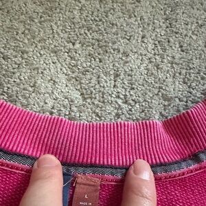 Great condition. Intentional fading and distressing. V-neck and split hem at the back. Hot pink. 100% cotton. Some blue marks on the inside collar (see photos). Size large.