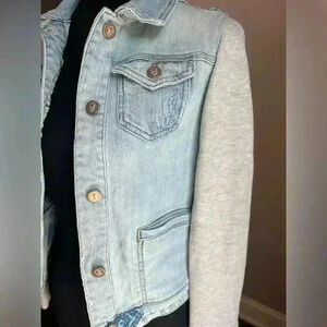 This unique jacket from Anthropologie's Pilcro collection features sweatshirt sleeves and embroidered accents, adding a touch of personality to your wardrobe. The jacket is made of high-quality cotton denim and has a button closure. It is a basic jacket style, with a blue color that will complement any outfit.