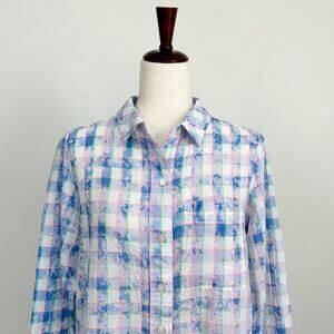 Small Anthropologie Pilcro & The Letterpress button-up shirt. Blue tie-dye check pattern with neon stripes. One front pocket. Relaxed fit. No flaws, great condition!