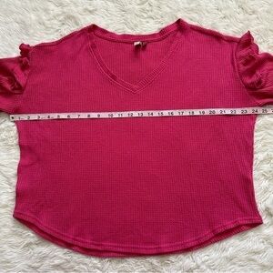 Anthropologie Pilcro Top Ruffled V-Neck Shirt Waffle Knit Raspberry Pink L