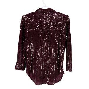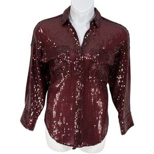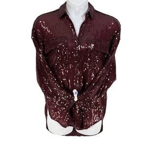 Anthropologie Pilcro Womens Size XS Oversized Deep Burgundy Sequin Button Up Sparkle Holiday Shirt Fairy Glam Top
