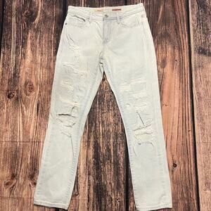 Keywords: Anthropologie jeans, women's jeans, boyfriend jeans, size 29 jeans, blue jeans, light wash jeans, distressed jeans, high-quality denim, slim fit jeans, casual wear, everyday wear, pre-owned jeans, stylish jeans, comfortable jeans,