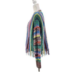 Long sleeve V-neck chunky knit cardigan sweater with a multicolor abstract striped design - shades of blue, aqua green, purple, yellow, orange & black. 3 buttons down the front. Decorative fringe on the bottom edge. Acrylic & Cotton blend. Hippie, boho, bohemian, retro, western, hipster